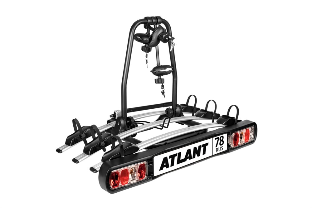 Велоплатформа для перевозки 3 велосипедов на фаркопе автомобиля предназначена для транспортировки на автомобиле на любые расстояния велотехники общим весом до 45 килограммов наиболее оптимальным, безопасным и удобным способом. Платформа Atlant Master Rider может устанавливаться на любой фаркоп со стандартным шаром диаметром 50 мм. Изделие состоит их прочного стального каркаса, на котором закреплены алюминиевые ложементы для размещения велосипедов. Фиксаторы колес, оборудованные резиновыми зубчатыми ремнями, позволяют прочно закрепить колеса и обеспечить их полную неподвижность во время движения. Держатели рамы надежно фиксируют перевозимую технику в верхних точках. Они также выполнены их стальных труб с защитной порошковой покраской черного цвета. Зажимы с резиновым уплотнением затягиваются с помощью мощных барашков. Барашки имеют встроенные стальные замки для защиты перевозимого имущества от краж. Таким же антивандальным замком оборудован узел крепления платформы на фаркопе. Платформа имеет возможность поворачиваться (наклоняться) вместе с велосипедами для получения возможности доступа к багажнику автомобиля. Для этого в блоке крепления существует специальный откидной механизм с рычагом. Задняя часть платформы оборудована габаритными огнями (задними фонарями, стоп-сигналами, указателями поворотов и сигналом заднего хода), а также рамкой для размещения дополнительного государственного номера. Светотехника подключается к розетке фаркопа посредством имеющейся в комплекте проводки с вилкой 13-pin со съемным переходником на 7-pin.